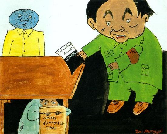 Hij was vijf jaar, toen hij de grens over vluchtte. Tijdens het interview was hij 14 jaar. Hij herinnert zich niet veel meer van Tibet. “De persoon onder tafel is Tibet. Deze tekening verteld aan de mensen om niet alleen erbij te staan en te kijken, maar om ons ook te helpen”. Deze tekening is een duidelijke weergave van de politieke positie van Tibet. Tibet kruipt weg onder de tafel van de internationale diplomatie, als Deng met een waarschuwende vinger in zijn richting wijst. De rest van de wereld kijkt toe in de vorm van een door de war mannetje met een hoofd in de vorm van een wereldbol. Hij staat er alsof zijn handen gebonden zijn, met niets om op de tafel te leggen. Deze tekening toont Namgyals bekendheid met het nieuws, zowel in stijl (afgeleid van de Indiase krantencartoons) als inhoudelijk. Tibetaanse vluchtelingen lezen (ook in westerse kranten) over hun thuisland en China’s controle ervan in India. Ook lezen ze over het Chinese protest tegen India’s bescherming van de door hun zogenoemde “Dalai kliek”. De groep Tibetanen in India blijft dankbaar voor hun hopelijk tijdelijke thuis in India.