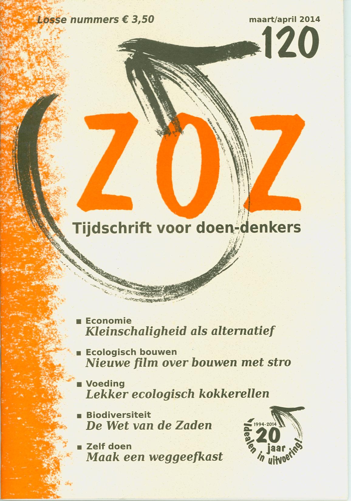 Uitgave: Omslag, werkplaats voor Duurzame Ontwikkeling. Nummer: 120 (maart/april 2014) Verschijnt elke 2 maanden. Een abonnement kost € 15,00 per jaar. ZOZ is een tijdschrift, waarin een groot scala aan onderwerpen besproken wordt. In dit nummer passeert een 25-tal onderwerpen de revue. Dit alles in een tijdschrift van 50 bladzijden. Hierbij komt een aantal vaste onderwerpen aan de orde, zoals de Aktie Agenda, Anders Wonen Anders Leven, Nieuws, Ingezonden brieven, enz. Daarnaast staan er veel artikelen in over een groot scala aan onderwerpen. Daarbij ligt de nadruk op duurzaamheid. U vindt er ook recensies van relevante boeken en films en verslagen van activiteiten, die bij Omslag hebben plaatsgevonden. Als u geïnteresseerd bent in alternatieve leef- en woonvormen, dan vindt u in dit blad hiervan beschrijvingen, bijvoorbeeld in dit nummer staat een stukje over Vereniging VELT, die haar 40-jarig bestaan viert en een verslag van de landelijke ontmoetingsdag voor leden van woongemeenschappen. Verder staan er tips in over hoe u zelf op een duurzamere manier kunt leven. Kortom, het is een zeer interessant tijdschrift voor mensen, die streven naar een andere, duurzamere en humanere wereld. ZIJN EN DOENNieuwjaarsbijeenkomst De opzet voor de eerste bijeenkomst in het nieuwe jaar was duidelijk. Herdenken van het feit dat honderd jaar geleden de 1e w.o. uitbrak en als ander uiterste de nieuwste ontwikkelingen op het gebied van wapentuig: drones, killer robots, zelfdenkende artillerie, etc. (de mens is jammer genoeg altijd goed geweest in het uitvinden van dergelijke spullen). We hadden het programma redelijk vol zitten: presentatie van de stichting “Eindhoven in Beeld” : beeldmateriaal en toelichting op de Nederlandse positie in de 1e w.o. : neutraal maar toch…….. 14.00u: gespreksronde over de 1e wereldoorlog met: Ludo De Brabander, Belgisch journalist/publicist; Leo van Bergen, historicus/polemoloog; Joost Vullings, historicus (Eindhoven in Beeld); Anton Kruft, Stichting Studiecentrum 1e W.O. 14.45u: Baban Kirkuki & Dawud Pirzab: verhalen en gedichten uit Irak en Afghanistan. 16.00u: muzikaal intermezzo door Aid Nrkonjiv 16.30u: informatie van IKV/Pax Christi (Miriam Struyk) over “drones” en de wereldwijde campagne om deze nieuwe vorm van oorlogsvoering onder de aandacht van het publiek te brengen. 17.45u: gemeenschappelijke wereldmaaltijd.