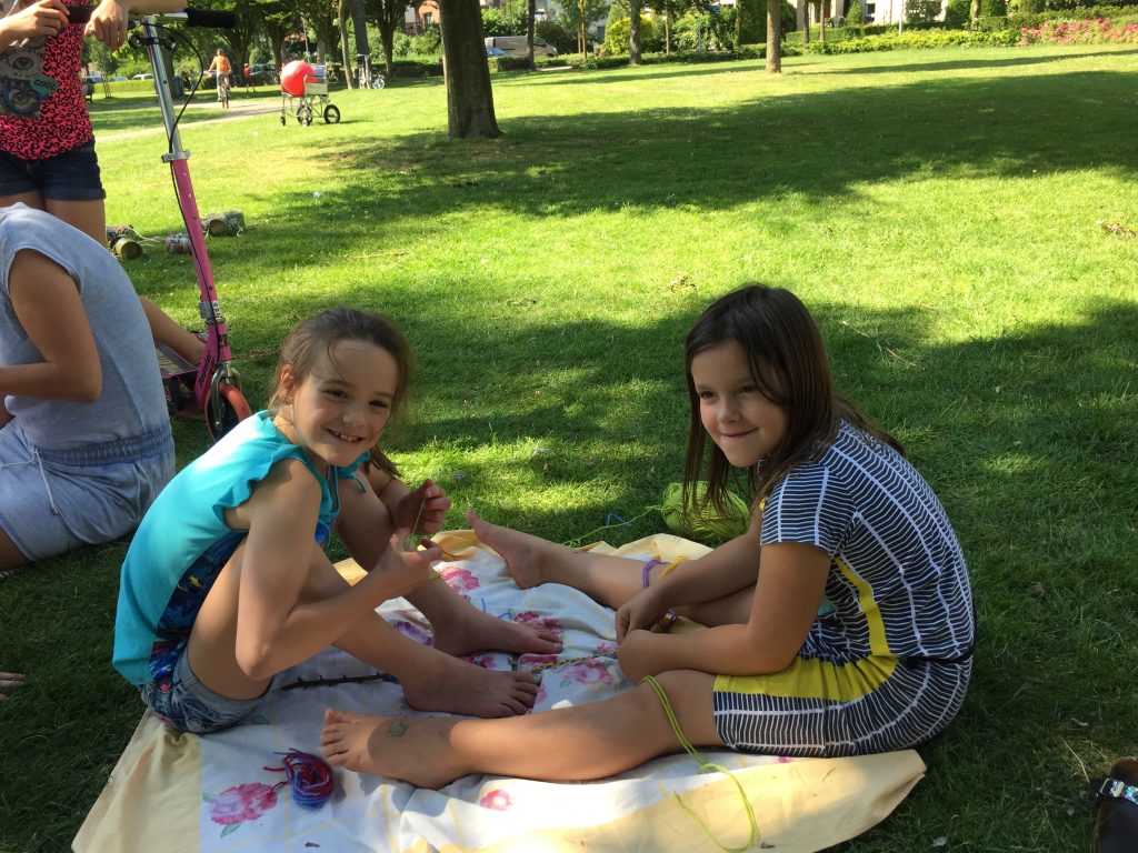 Elders in het grote Wilhelminapark deden kinderen allerlei bewegingsspelen. Bij ons was het knutselen favoriet. De kinderen speelden met stokjes en wollen draadjes. Ze bouwden huisjes en maakten armbandjes en vlechtjes. En intussen vroegen ze zich af, hoe kinderen spelen in een stad waar alles kapot is. Ze maakten ook tekeningen voor de kinderen van school Hîvî.